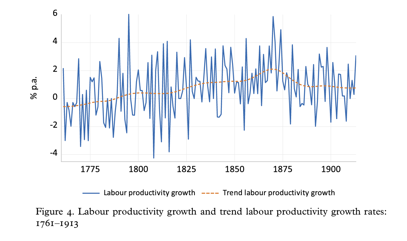 One explanation is a parochial British one. Obsessed as they were with “relative decline”, generations of British economists debated whether high foreign investment, crimped domestic investment and, if so, whether the deceleration was driven by elite anti-industrial bias (yup the Brits got there first on that too), or by inadequate domestic consumer demand (the Hobson underconsumptionist line). The frame of the argument was provided by the “overtaking” of the US and Germany (a thesis stereotypically illustrated by Alfred Chandler in Scale and Scope) and by the more technical empirical finding from the then available GDP numbers (Feinstein’s data were key), which appeared to show that around 1900, Britain experienced decelerating growth – the so-called “Edwardian climacteric” thesis. This narrative has not withstood the latest generation of empirical economic history. Newly revised data for Britain’s GDP, labour productivity and TFP show a relatively steady increase in productivity growth across the industrial revolution from the 1770s to the 1870s; an upward “blip” and a downward “shock” around 1873; followed by stabilization on a high plateau of steady productivity growth by historical standards.