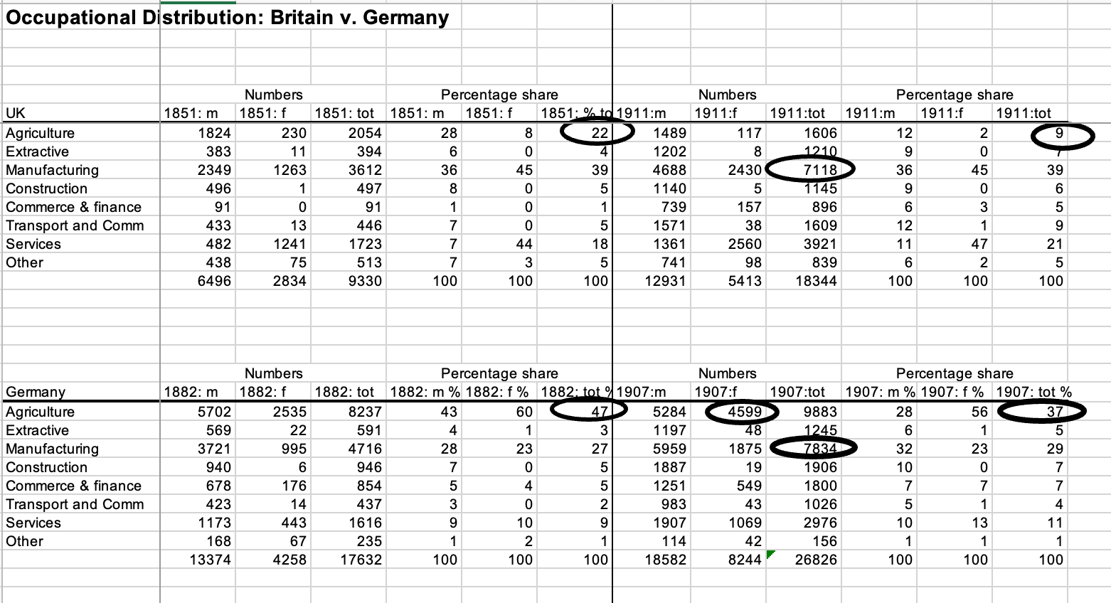 Of course this engendered structural change in Britain, but the biggest difference to comparable European economies, Germany for example, was not the supposed relative decline of British manufacturing (a hotly debated topic in British economic history) but the end of inefficient small-holding agriculture. By 1911 there were few if any “peasants” in the United Kingdom, other than in Ireland, where, for political purposes, London was pursuing a strategy of “peasantization”.