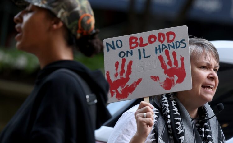 Dozens of protesters gathered in the Loop Monday morning to demand Illinois State Treasurer Michael Frerichs divest the state’s investments from Israel bonds.