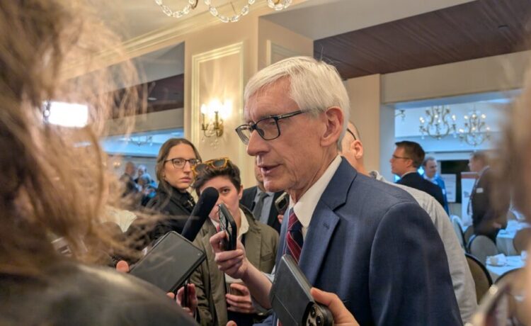 Gov. Tony Evers speaks to reporters in March 2025. Evers has written the Department of Energy urging officials not to cancel $1.5 billion in funds for Wisconsin projects. (Photo by Baylor Spears/Wisconsin Examiner)