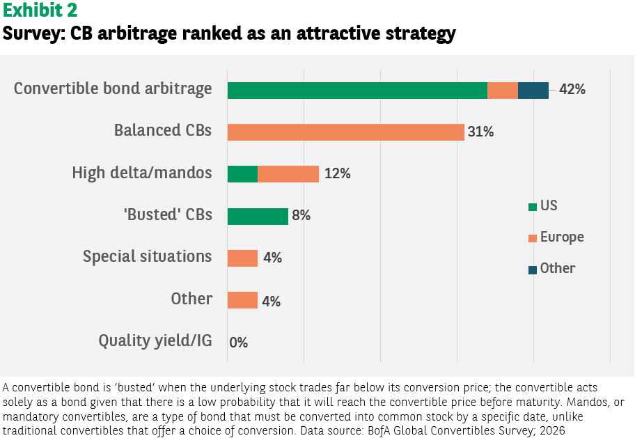 According to the BofA survey, 42% of respondents identify CB arbitrage as the most attractive strategy (see Exhibit 2), making it the clear top choice across the asset class and marking the fourth consecutive quarter it has led investor preferences.