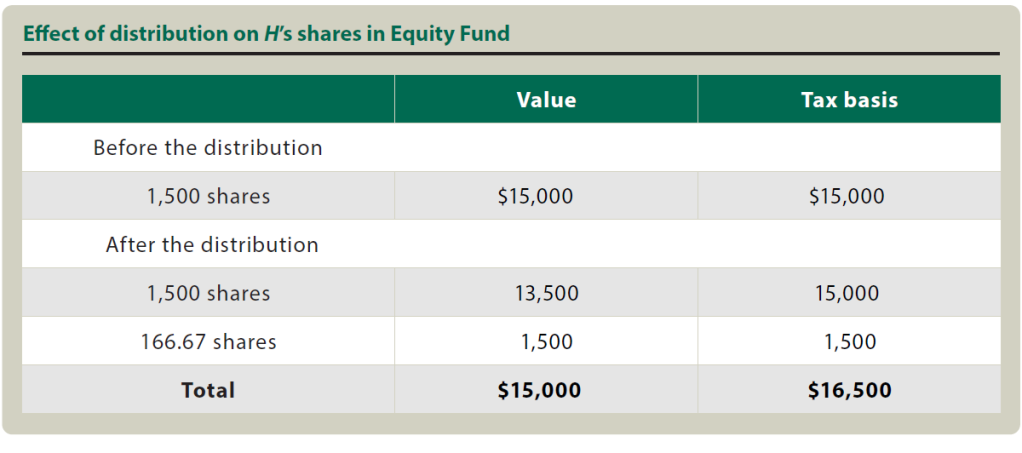 Example 1.Untimely purchase of mutual fund shares results in “purchasing” a tax liability: H invested $15,000 in the ABC Equity Fund on Dec. 12, 20X1, when the price per share was $10. On Dec. 19, 20X1, the fund declared an income distribution of $1 per share to shareholders of record on Dec. 19, 20X1. On Dec. 26, 20X1, the fund distributed $1 per share, which reduced the price per share to $9. H’s $1,500 ($1 per share × 1,500 shares) distribution was automatically reinvested, resulting in an additional 166.67 shares ($1,500/$9 per share). H’s holdings in the fund before and after the distribution were as shown in the table, “Effect of Distribution on H’s Shares in Equity Fund,” below.