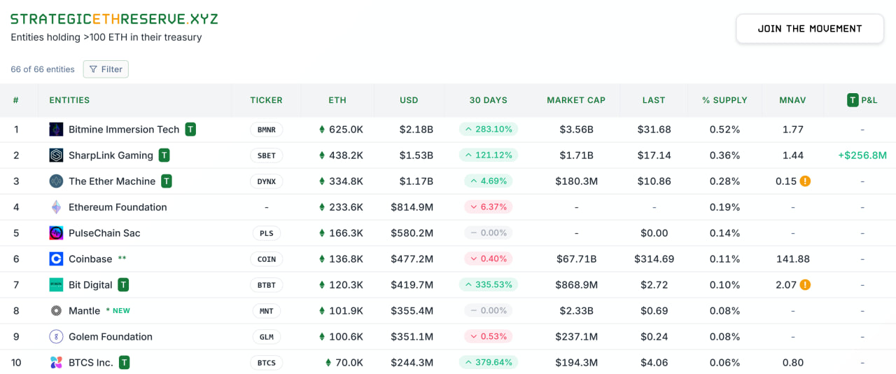 The buying spree comes on the heels of BitMine’s aggressive pivot into Ether. StrategicEtherReserves shows BitMine as the largest Ether treasury firm with 625,000 Ether (ETH), followed by SharpLink Gaming with 438,200 ETH.