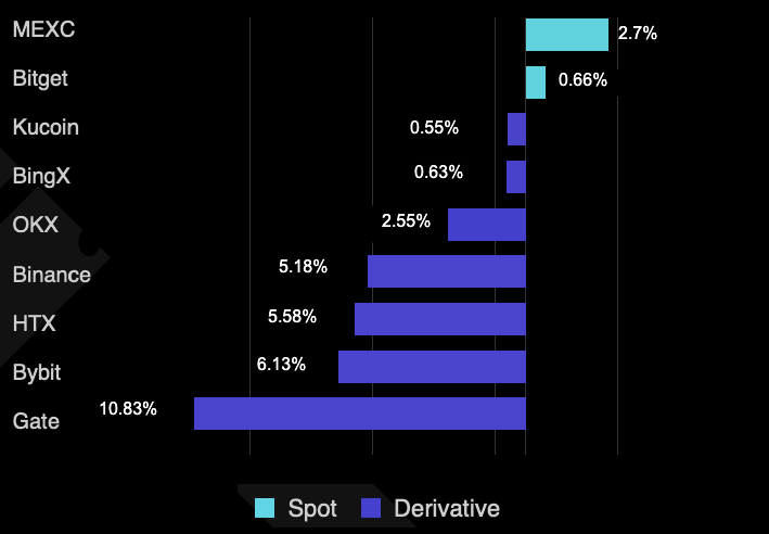 MEXC, which has rapidly emerged as a major CEX in recent years, recorded the largest gain in the spot trading market among exchanges in Q2, rising by 2.7%. The only other exchange to see spot trading growth was Bitget, with spot volumes edging up around 0.7%.