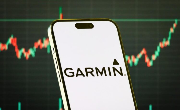 CHONGQING, CHINA – JULY 28: In this photo illustration, a smartphone held in a hand displays the logo of Garmin Ltd. (NYSE: GRMN), a multinational technology company known for its GPS navigation and wearable technology products, in front of a screen showing the company’s latest stock market chart on July 28, 2025 in Chongqing, China. (Photo illustration by Cheng Xin/Getty Images)